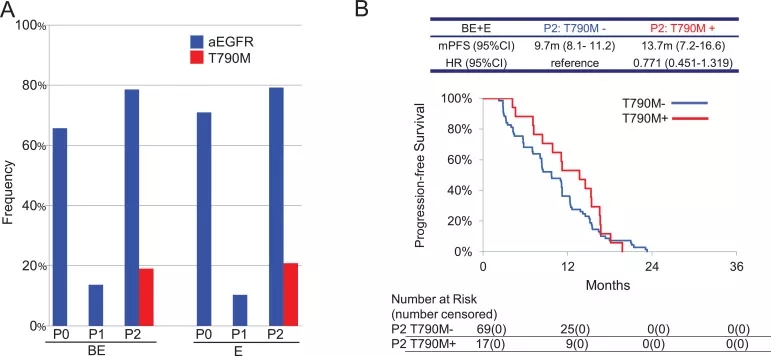 图5. T790M突变率(A);T790M+和T790M-患者的PFS(B)