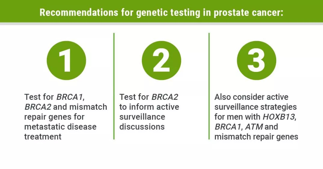 根据指导意见,用于转移性前列腺癌治疗的优先基因的检测应包括BRCA1、BRCA2和错配修复基因。为了获得临床试验资格,应该对ATM等基因进行更广泛的检测。