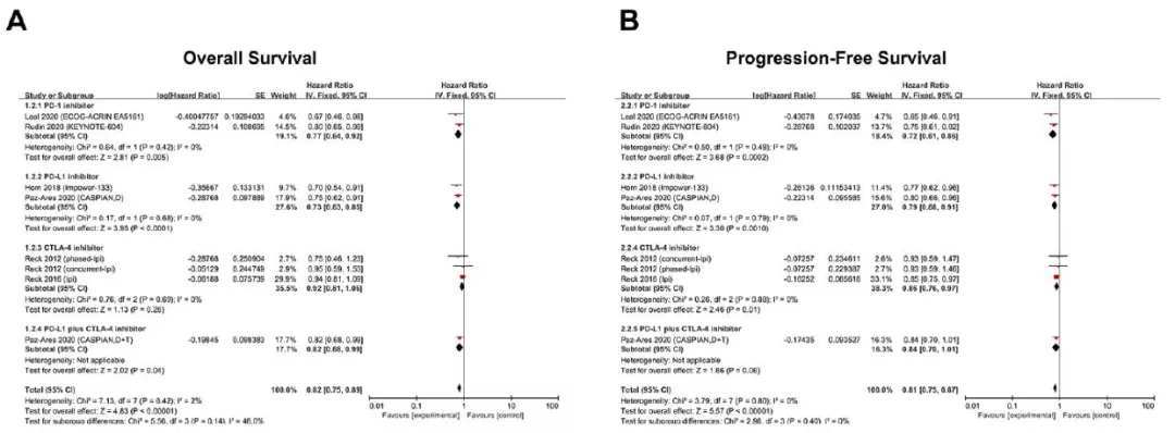 接受免疫检查点抑制剂联合化疗的患者,相比单纯化疗还可以提高PFS (HR=0.81; 95% CI: 0.75-0.87)及ORR (RR=1.04; 95% CI: 0.99-1.10)。