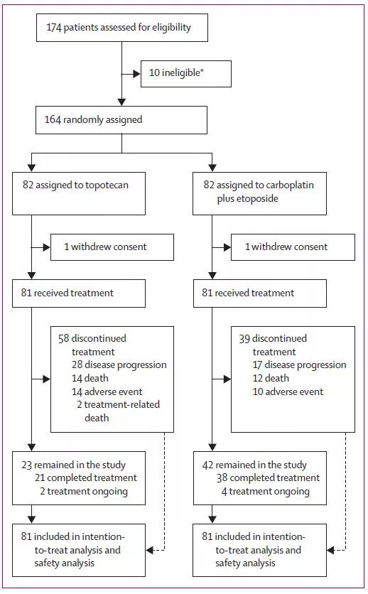 符合入组标准的患者1:1随机分入卡铂联合依托泊苷或口服拓扑替康组。用药方案为:卡铂AUC=5,每周期第1天给药,依托泊苷100mg/m2,每周期第1~3天给药,21天一个周期,患者治疗上限为6周期;拓扑替康2.3mg/m2,每周期第1~5天给药,每21天为一个周期,治疗上限为6个周期。治疗应当持续进行,直至疾病进展、出现不可耐受毒性反应,或患者撤销知情同意疗效。研究在第6周、第12周和第18周进行疗效评估。本研究的主要终点为无进展生存(PFS),次要研究终点为总生存(OS)、安全性及患者的生活质量等。
