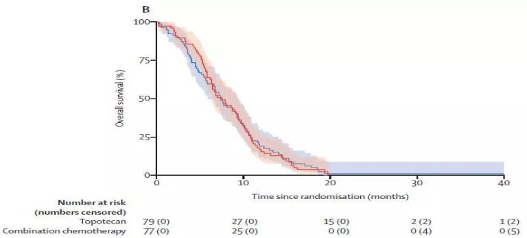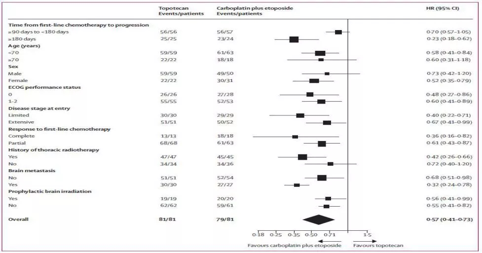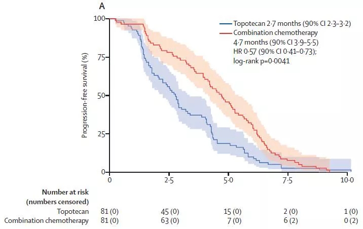 卡铂+依托泊苷和拓扑替康组的客观缓解率(ORR)分别为49%和25%(P=0.0024),中位反应持续时间分别为5.4个月和4.1个月。