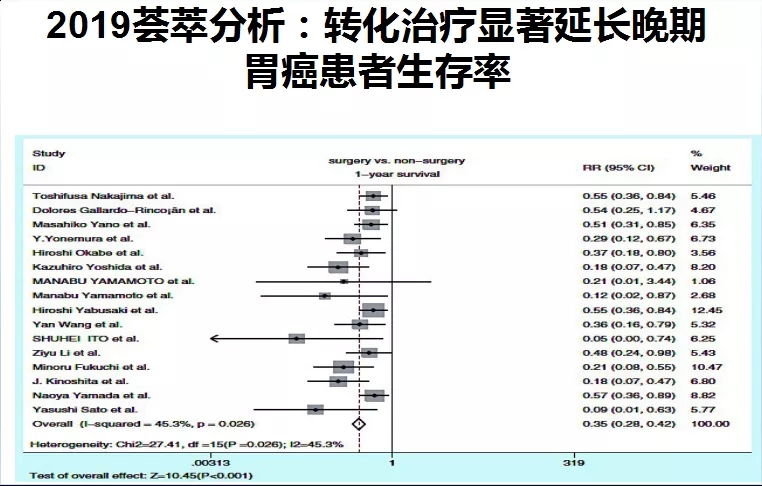 胃癌的转化治疗是指通过化疗、放疗及靶向或免疫治疗等手段将不可切除的胃癌转变为R0切除,延长无进展生存期(PFS)及总体生存率(OS),提高生活质量。近年来,转化治疗在晚期胃癌领域中的应用炙手可热,2019年Cancer Invest杂志上Du R等开展的一项Meta研究结果显示,转化治疗可显著改善晚期胃癌患者的生存率。