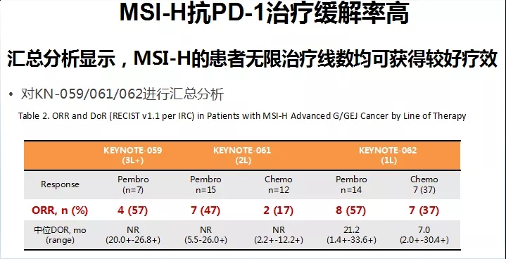 MSI-H/dMMR可见于约8%~37%的胃癌患者,主要可通过PCR或免疫组化的手段来检测,研究证明MSI-H/dMMR在多种瘤种免疫治疗的患者筛选中具有重要价值,在晚期胃癌中亦不例外。基于当前的研究结果表明,无论几线治疗,MSI-H的患者使用免疫治疗都可获得较好的疗效。