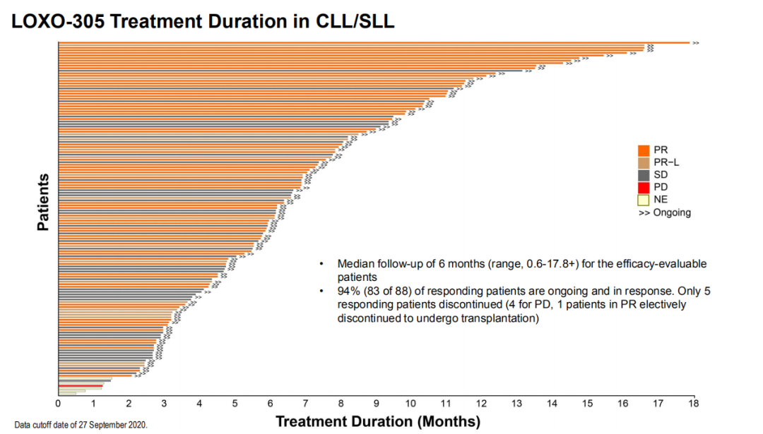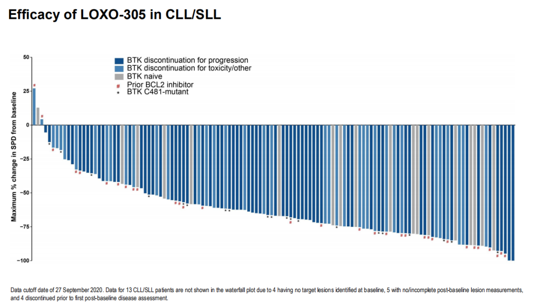 LOXO-305对于既往接受多轮治疗(包括共价BTK抑制剂和BCL2抑制剂)且预后较差的CLL/SLL患者表现出良好的疗效。并且LOXO-305的有效性并不局限于BTK C481突变患者。且LOXO-305耐受性良好,治疗窗较为宽泛。