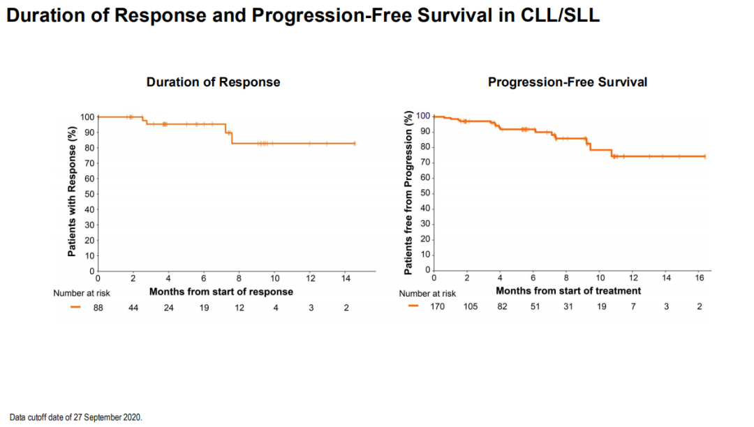 有效性方面:①88例CLL/SLL患者(94%)仍在接受治疗,65例CLL/SLL患者的疗效可评价(58例经过BTK抑制剂治疗患者,7例未经过BTK抑制剂治疗患者)。患者的中位随访时间为3个月(范围0.1-13),持续应答时间为6.7个月。ORR为57%,另外29例患者症等待影像学评估。如既往共价BTK抑制剂研究中观察到的,缓解随时间推移而加深;