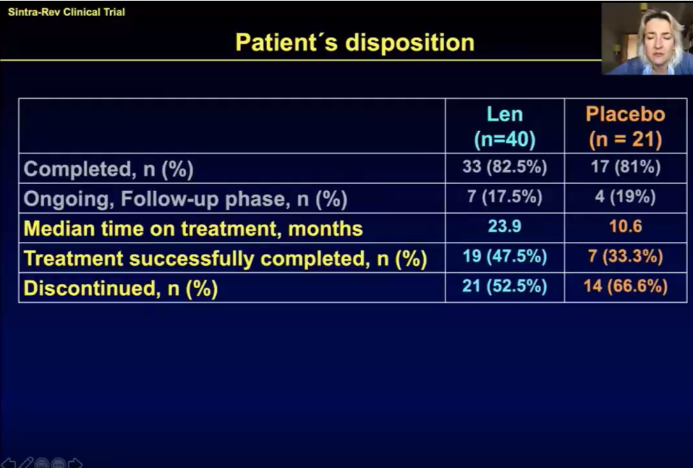 本研究纳入了61例患者,按照2:1的比例进行随机化分组,研究组接受来那度胺(5 mg/天连续给药)治疗2年和随访2年。本次研究为患者完成治疗阶段后(2020年3月)的中期分析结果。