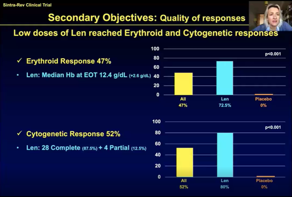 此次中期分析中,低剂量5mg来那度胺对于伴有 del(5q)非TD低风险MDS患者中可延长至TD的时间(75.7个月vs 25.9个月),改善Hb水平(72.5%的ER),70%获得了患CyR,但研究结果还有待数据进一步成熟。