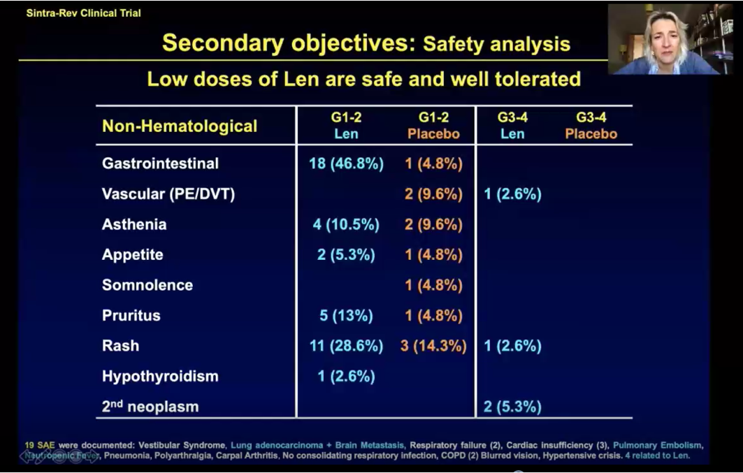 ②安全性方面:59例患者被纳入安全性可评价人群中,发生至少1起不良事件(AE),药物相关的AE分别为来那度胺组86.8%和安慰剂组33.3%(p<0.001)。13例患者报告了19起严重AE,其中4起可能与研究药物相关,无相关死亡。