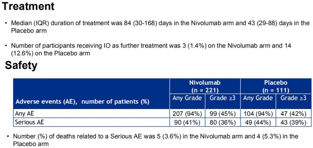 纳武利尤单抗组和安慰剂组的任何级别不良事件(AE)发生率皆为94%,≥3级AE发生率分别为45%和42%;≥3级严重AE发生率分别为36%和39%。纳武利尤单抗组因严重AE死亡的比例为3.6%(5例),安慰剂组为5.3%(4例)。