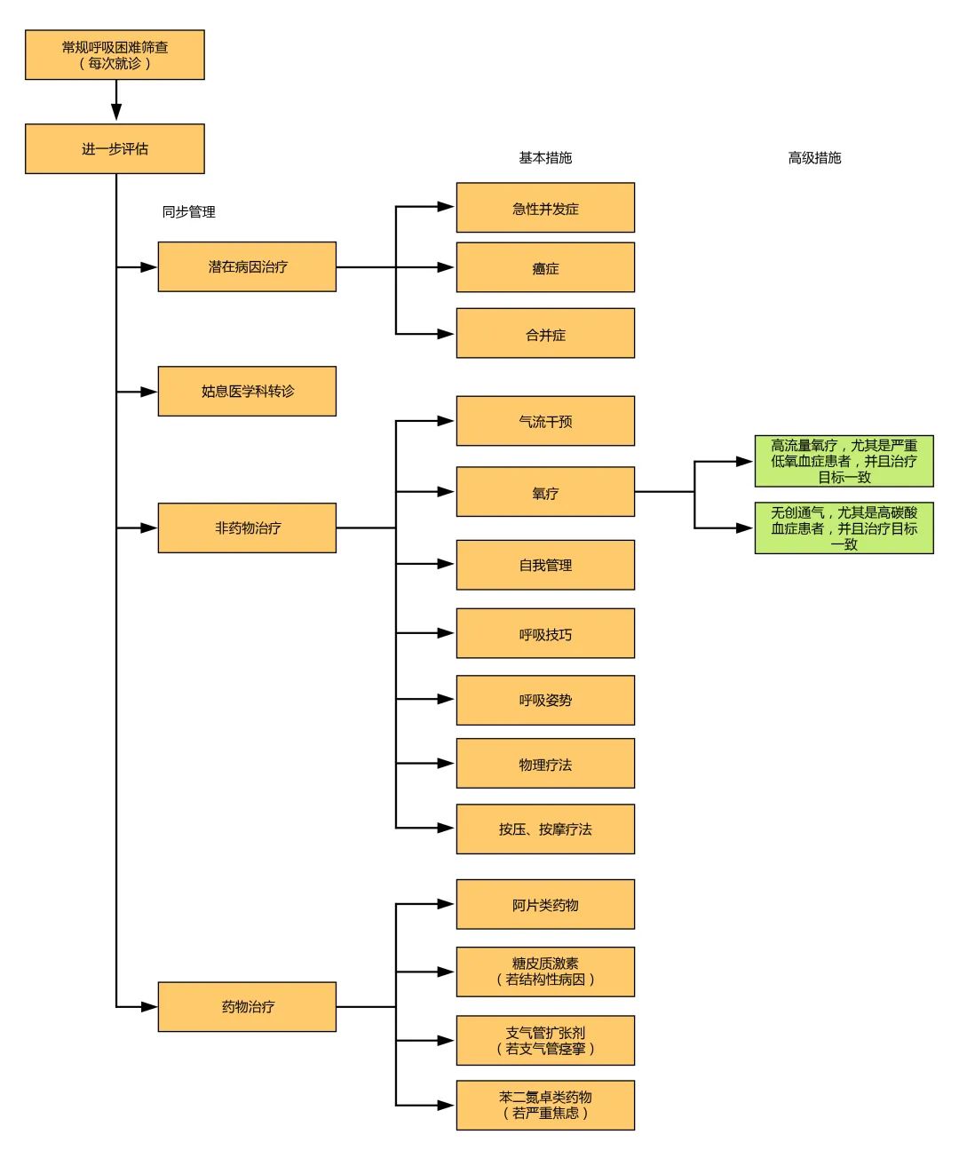 在门诊环境中,患者可能出现限制其日常活动的慢性呼吸困难。建议采用分层方法逐步引入干预措施,包括针对可逆原因的治疗、姑息治疗咨询、非药物措施和药物措施。