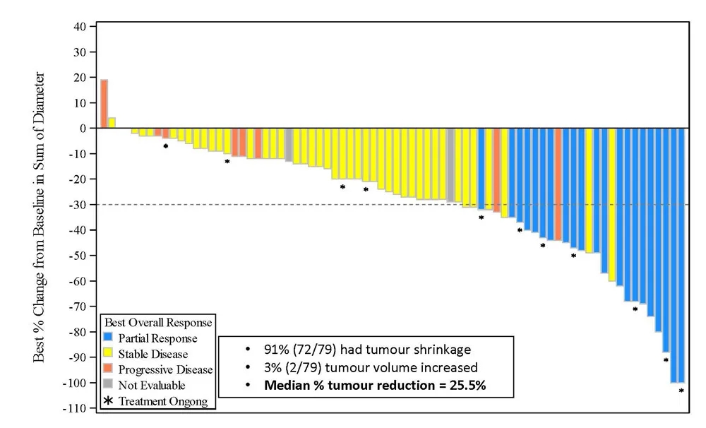 中位DoR为6.5个月,总的来说,91%的患者在意向治疗分析中显示肿瘤缩小;