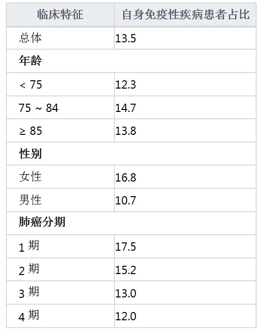 定义和诊断自身免疫性疾病通常很有挑战性。癌症的诊断通常只需要组织活检,自身免疫性疾病的诊断可能包括临床特征、体检结果、血清学、放射学检查和组织学检查。此外,某些自身免疫性疾病的特征性实验室检查结果,如抗核抗体,可在四分之一以上的健康成年人中存在。自体免疫疾病相对常见,在美国约有2000~5000万的患病者,包括14%~25%的肺癌患者(表2)。11自身免疫性疾病的发病率随着年龄的增长而增加12,因此这些共病对肺癌患者的影响可能更大。13