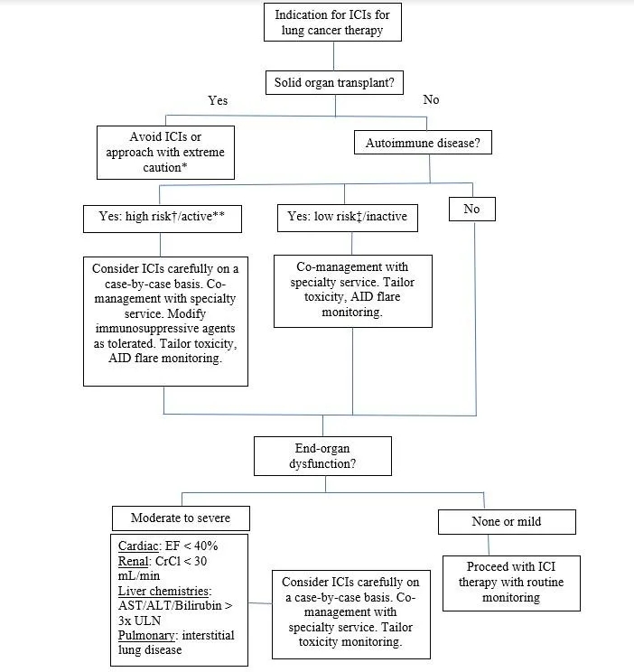 由于评估ICIs在合并症患者中的安全性和有效性的正在进行或已完成的临床试验很少,临床医生只能依靠在自身免疫性疾病、器官功能障碍或器官移植患者中使用ICIs的回顾性研究结果来指导医疗决策。基于目前的证据有限,我们提出了在这些人群中开展ICI研究的临床方法(如下图所示)。