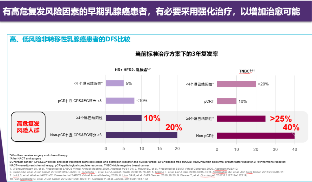 HR+/HER2-早期乳腺癌接受标准内分泌治疗,大部分中低危患者可获得治愈。对于有高危复发风险因素的早期乳腺癌患者,有必要采用强化治疗,以增加治愈可能。如CREATE-X研究中就对non-pCR患者进行了卡培他滨强化辅助化疗。