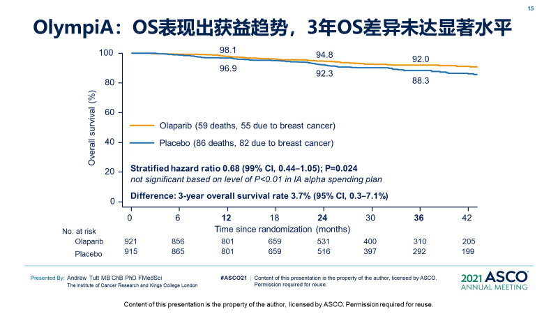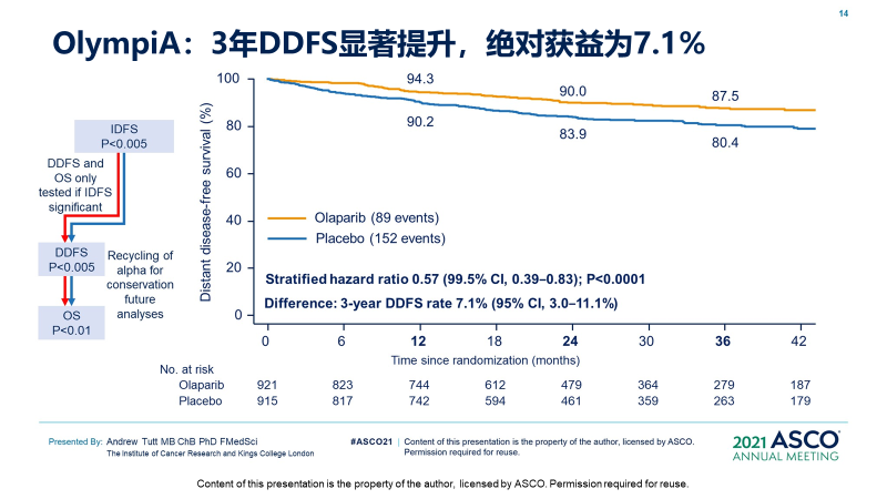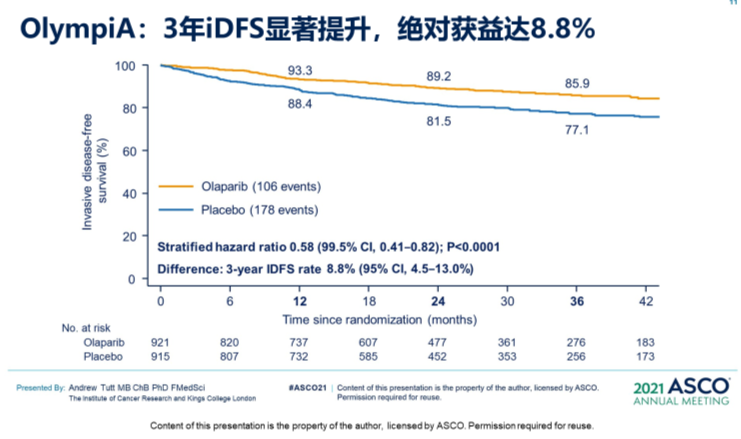 首先,只有iDFS有统计学意义,才能进入到下一步的分析。可以看到,该研究的iDFS改善确实非常明显,绝对获益达8.8%,具有显著统计学差异,两组3年iDFS率分别为85.9% 和77.1%,奥拉帕利治疗降低了患者的浸润性肿瘤复发或死亡风险达到42%(HR=0.58;99.5%CI:0.41~0.82;P<0.001)。3年DDFS率显著提升,绝对获益为7.1%(87.5% vs. 80.4%)。
