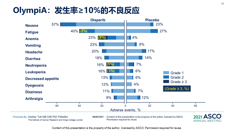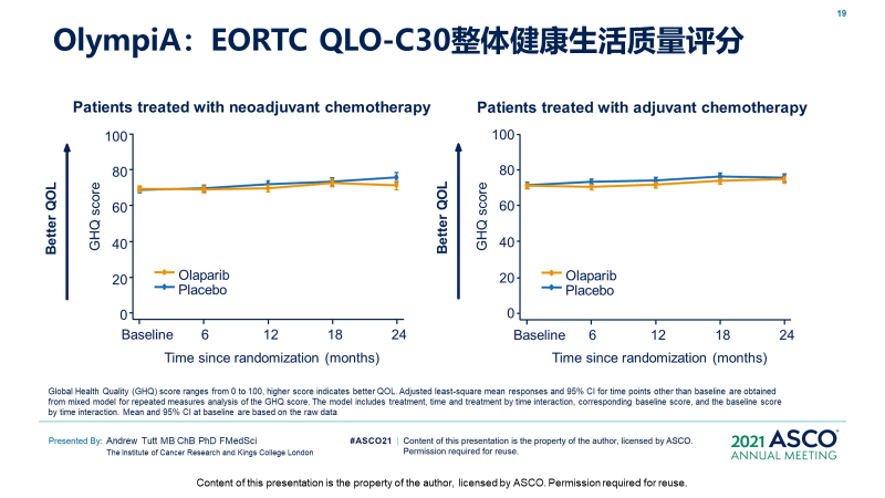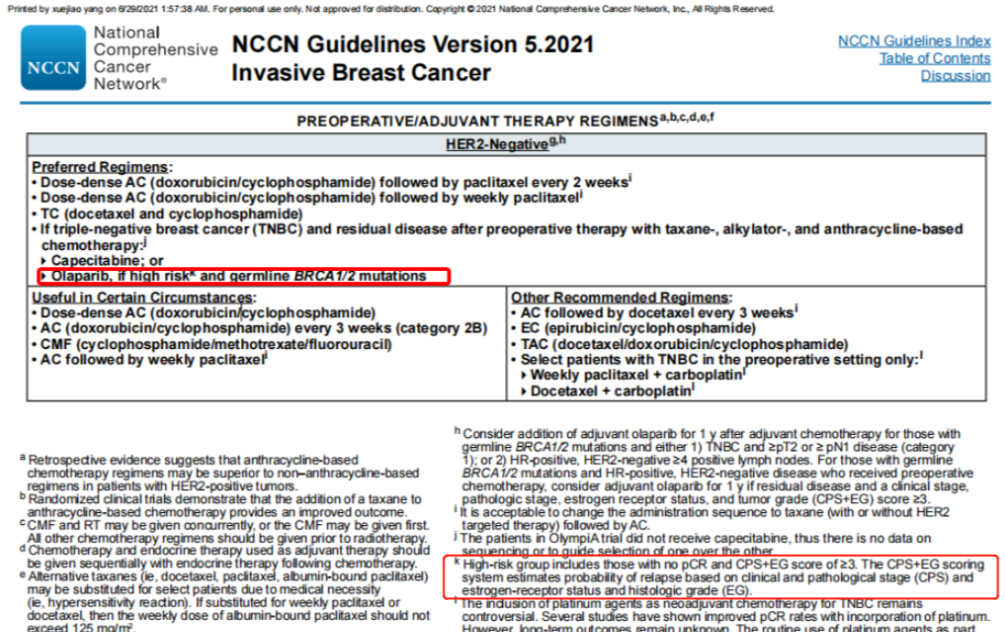 在患者的生活质量和不良反应方面,两组间差异不大,因严重不良事件而退出治疗的患者比例也不高。这项研究结果已经被最新版的NCCN乳腺癌指南纳入,所以,该研究对BRCA突变的早期乳腺癌患者的辅助治疗是有深远意义的。