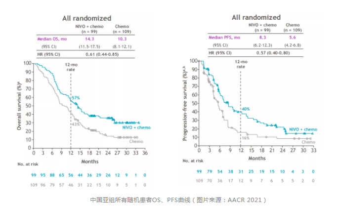 在所有随机人群中,纳武利尤单抗联合化疗组的中位OS为14.3个月,中位PFS为8.3 个月;单独化疗组分别为10.3 个月和5.6个月。