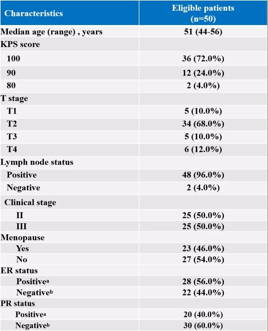 该项研究于2019年3月~2021年2月在4家治疗中心共入组了54例HER2+早期乳腺癌患者,对最终符合条件的50例患者(表1)给与ATH方案(A:PLD 40mg/m2,T:多西他赛 75mg/m2,H:曲妥珠单抗 首剂量8mg/kg,维持量6mg/kg, Q3W)6周期新辅助化疗。主要研究终点是tpCR和bpCR,次要研究终点是安全性。
