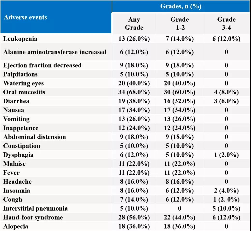 结果显示:整体人群的tpCR为48%(24/50)[95%CI:33.7%~62.6%], bpCR为60% (30/50)[95%CI:45.2%~73.6%]。按激素受体(HR)不同的表达状态进行分层,HR-组tpCR为57.1%(12/21)[95%CI:34.0%~78.2%],bpCR为76.2%(16/21)[95%CI:52.8%~91.8%];HR+组tpCR和bpCR分别为41.4%(12/29)[95%CI:23.5%~61.1%]和48.3%(14/29) [95%CI,29.4%~67.5%];HR-患者的bpCR明显高于HR+患者(P=0.047)。化疗相关的不良反应中较为常见的3/4级不良事件依次为手足综合征(12.0%)、白细胞减少(12.0%)、间质性肺炎(10%)和口腔黏膜炎(8.0%)(表2)。其中1例患者因为4级间质性肺炎而死亡,9例患者出现左室射血分数(LVEF)下降,但均未低于50%,且最终逐渐恢复,所有患者无充血性心力衰竭事件发生。