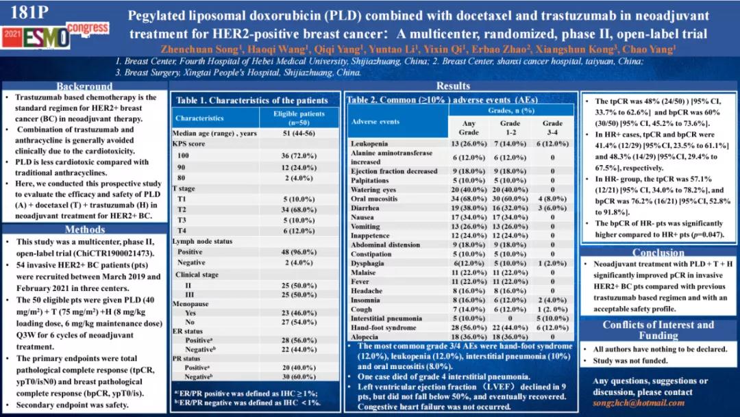编者按:对于接受抗HER2治疗的乳腺癌患者来说,蒽环类和紫杉醇类药物是乳腺癌抗肿瘤治疗的基石。但传统蒽环类化疗药物与曲妥珠单抗连用会产生一定的心脏毒性,为尽可能减少患者的心脏毒性,河北医科大学第四医院宋振川教授团队开展了一项研究,该研究用ATH方案(多柔比星脂质体+多西他赛+曲妥珠单抗)治疗HER2+乳腺癌患者,结果显示ATH方案能使HER2+乳腺癌患者新辅助治疗获得较高的pCR率,且整体安全性较好,心脏毒性可控。该研究结果于日前在2021年欧洲肿瘤内科学会年会(ESMO 2021)上进行了壁报展示。