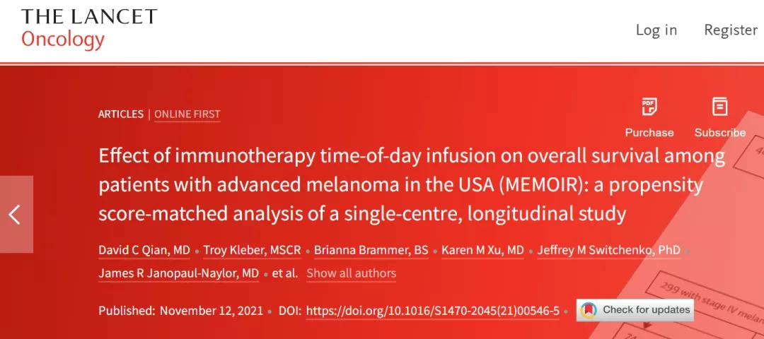2021年11月12日,一项发表在《柳叶刀-肿瘤学》的匹配分析研究,探讨了输注ICIs的特定时间模式是否会影响黑色素瘤的治疗效果。
