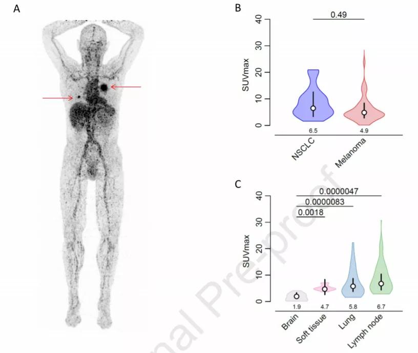 研究共纳入18例晚期患者,其中黑色素瘤11例,非小细胞肺癌(NSCLC)7例。89Zr-pembrolizumab在黑色素瘤和NSCLC中的摄取率相似(P=0.049),而且在5mg时的摄取量在脾脏中最高,平均SUVmean为5.8(±SD 1.8)。Waldeyer环、正常淋巴结和炎症部位也有89Zr pembrolizumab摄取。