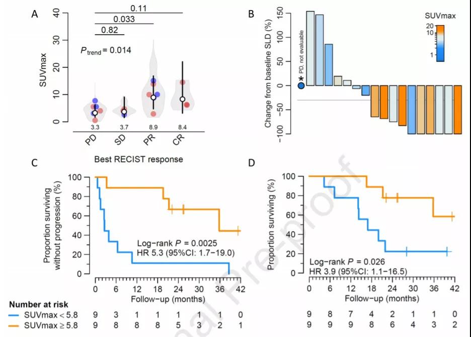 (2)89Zr-pembrolizumab在肿瘤病变中的摄取与PD-1单抗治疗反应相关(Ptrend=0.014),摄取量高的患者,肿瘤缓解更明显。