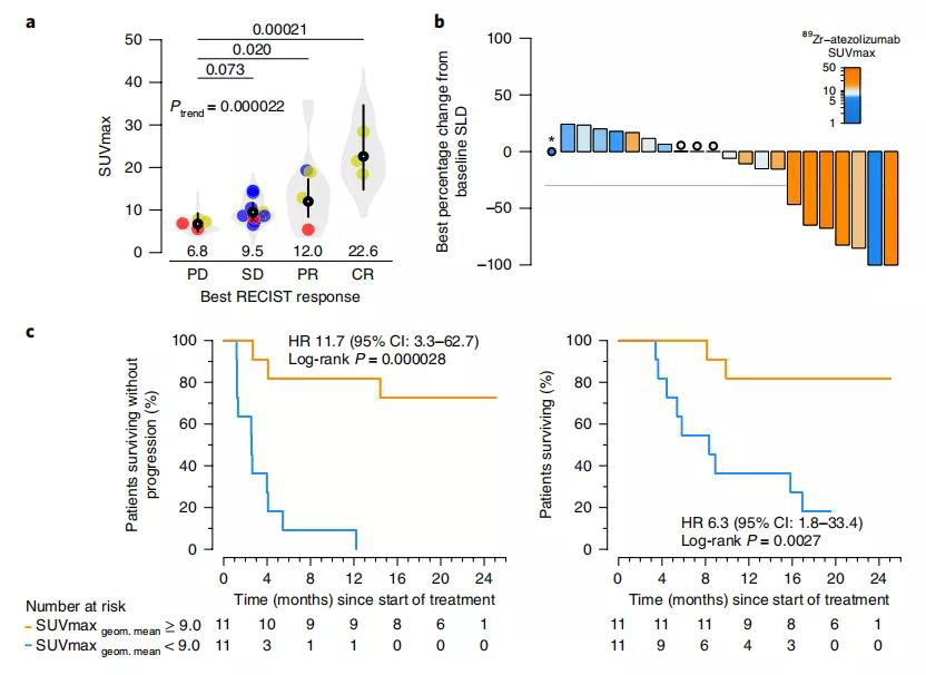 在疗效和生存获益方面也是,89Zr-atezolizumab摄取率高的患者,肿瘤缓解更明显,PFS(HR 11.7,P=0.000028)和OS(HR 6.3,P=0.0027)获益更显著。