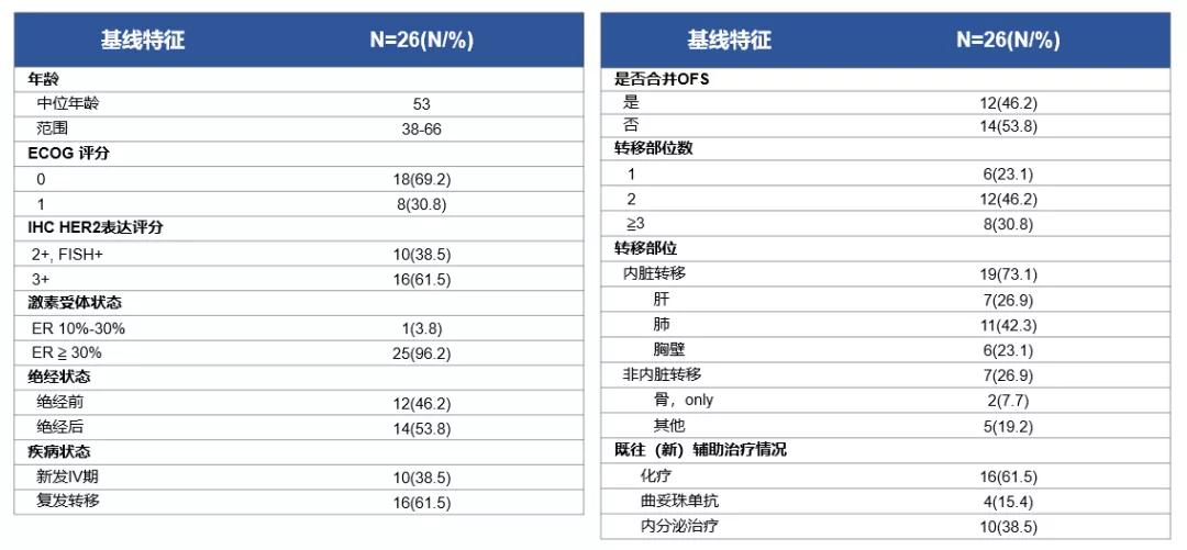 2019年12月3日至2021年4月2日期间,研究共入组了26例患者,中位年龄为53岁,61.5%的患者为HER2 3+,96.2%的患者为ER≥30%;绝经前患者占46.2%;复发转移患者占61.5%,转移部位数为2和≥3的比例分别 为46.2%和30.8%,有内脏转移的患者占73.1%,既往有(新)辅助化疗、曲妥珠单抗治疗、内分泌治疗的比例分别为61.5%、15.4%和38.5%。