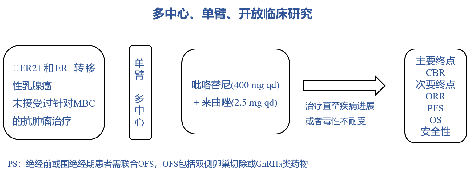 这是一项多中心、单臂的II期研究,入组患者为经组织学证实HER2阳性(IHC 3+或IHC 2+且FISH+)和ER阳性(ER+细胞百分比≥10%)的绝经前/围绝经期或绝经后转移性乳腺癌患者,未接受过针对复发/转移阶段的治疗。患者接受吡咯替尼(400mg,po,qd)联合来曲唑(2.5mg,po,qd)治疗,直到疾病进展或出现不可接受的毒性。绝经前/围绝经期患者需联合卵巢功能抑制(OFS)治疗。