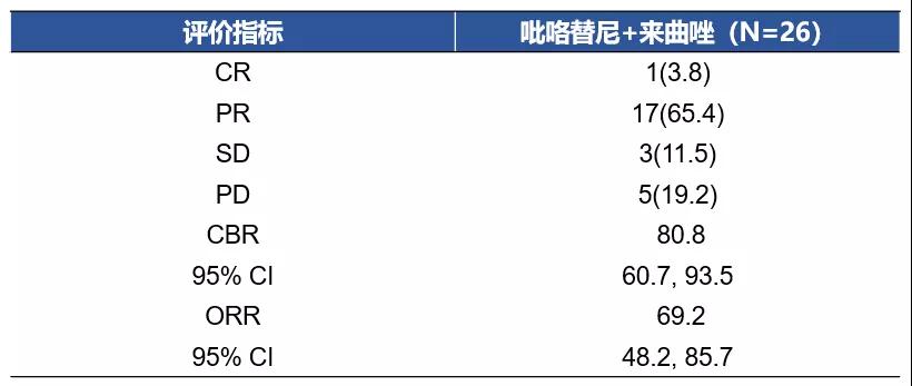 截至2021年11月4日,26例入组患者中有21例达到CR/PR/SD(≥24周),CBR为80.8%(21/26,95%CI:60.7%~93.5%),ORR为69.2%(18/26;95%CI:48.2%~85.7%)。在这26例患者中,有1例(3.8%)为CR,17例(65.4%)为PR,3例(11.5%)为SD,5例(19.2%)为PD。亚组分析中,没有观察到既往是否接受曲妥珠单抗或内分泌治疗对疗效的影响。
