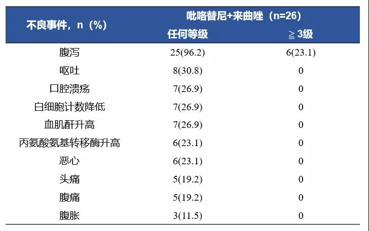 最常见的任何级别不良事件为腹泻(25/26,96.2%)、呕吐(8/26,30.8%)、口腔溃疡(7/26,26.9%)、白细胞计数降低(7/26,26.9%)、血肌酐升高(7/26,26.9%)、ALT升高(6/26,23.1%)、恶心(6/26,23.1%)等。腹泻是唯一报告的3级不良事件,共报告了6例患者(23.1%)。本研究期间未发生4级或5级不良事件。
