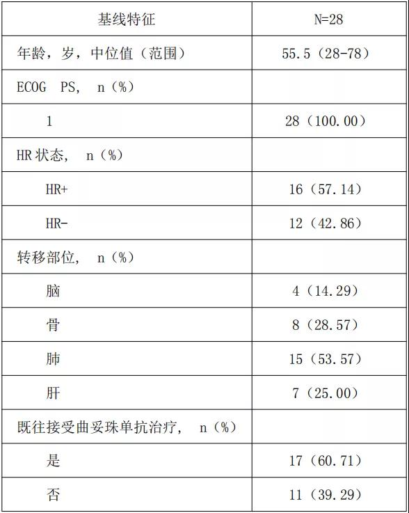 ■  研究方法:本研究是一项前瞻性、单臂、多中心的临床研究,从2020年4月~2021年6月,共入组28例晚期一线HER2阳性复发/转移性乳腺癌患者。所有患者均接受吡咯替尼联合曲妥珠单抗加白蛋白结合型紫杉醇治疗。主要研究终点为无进展生存期(PFS);次要研究终点为总生存期(OS)、客观缓解率(ORR)、疾病控制率(DCR)、疗效持续时间(DoR)、临床获益率(CBR)和安全性。
