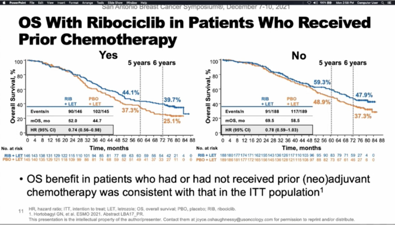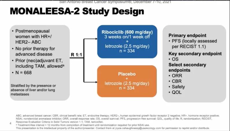 ◆ 方法:将绝经后的HR+/HER2-晚期乳腺癌按照1:1随机分为接受RIB+LET及PBO+LET一线治疗。根据基线病灶转移的部位,如仅骨转移(是/否),肝脏转移(是/否),肝脏或肺脏转移(是/否)和转移部位的数目(<3或≥3)进行分层。由于为探索性分析且无显著统计效力,该数据仅为假设提出。