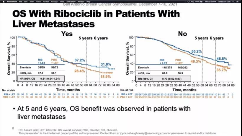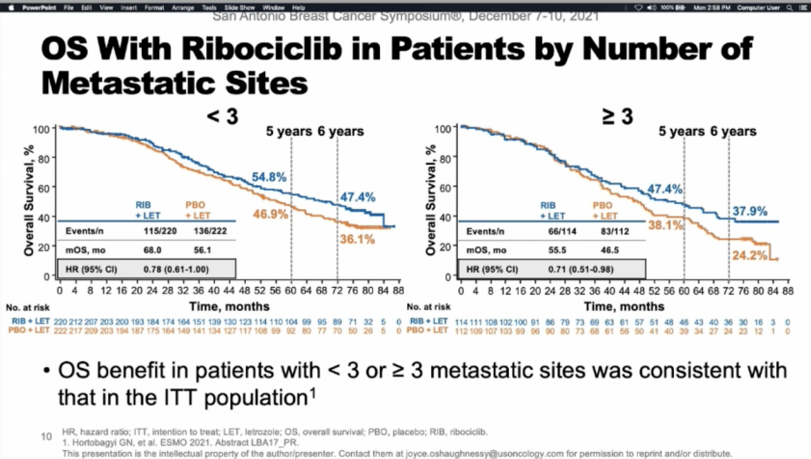 ◆ 结果:共入组668例患者,无论基线转移的状态如何,所有亚组结果均倾向于RIB+LET。根据基线位置和转移部位的数量,RIB+LET在临床相关亚组中证明了比PBO+ LET在OS上获益,包括肝转移、肝或肺转移和转移部位的数目≥3个的患者亚组,这些患者通常预后较差。