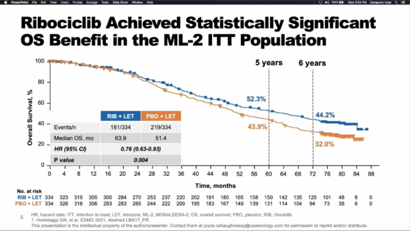 MONALEESA-2在基于转移部位划分的临床亚组分析中,RIB+LET的OS获益均大于PBO + LET。虽然在肝转移组OS绝对值获益并不显著,但其6年总生存率,RIB+LET为31.0%,相比于PBO+LET的18.9%还是有一个较明显的提升(HR,0.81;95%CI:0.54~1.24)。值得注意的是,此次研究者汇报的是预先设定的根据基线肿瘤转移病灶的部位和数量进行分层的OS探索性分析结果,由于为探索性分析且无显著统计效力,该数据仅为假设提出。不能够充分说明CDK4/6抑制剂在不同转移部位、不同转移个数中的疗效差异。亚组分析的结果不断地给我们提供新的研究、治疗思路,CDK4/6+的内分泌治疗时代的个体化精准化治疗道阻且长,我们需要更长时间的观察与探索,期待更好的数据。
