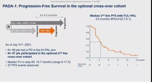 在PAL+AI组后续出现疾病进展的70例患者中,47例采用PAL+Ful作为二线治疗(交叉队列)。在交叉队列中,中位随访时间14.7个月, PAL+Ful二线治疗中位PFS为3.5个月。