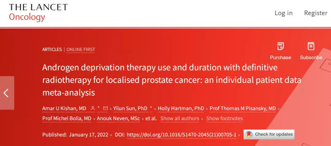 Kishan AU, Sun Y, Hartman H, et al. Androgen deprivation therapy use and duration with definitive radiotherapy for localised prostate cancer: an individual patient data meta-analysis [published online ahead of print, 2022 Jan 17]. Lancet Oncol. 2022;S1470-2045(21)00705-1. doi:10.1016/S1470-2045(21)00705-1