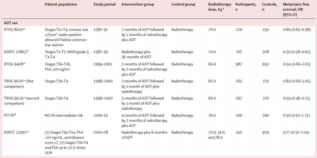 这项最新发表于Lancet Oncol的荟萃分析中,研究人员对MEDLINE、Embase、试验注册、Web of Science、Scopus和会议记录进行系统的文献检索。纳入的多中心随机试验是在接受明确放疗的局限性前列腺癌男性中评估使用或延长ADT(或两者),报告或收集远处转移和生存数据,并在协议定义的有限持续时间内使用ADT。研究的主要结局是无转移生存(MFS)。