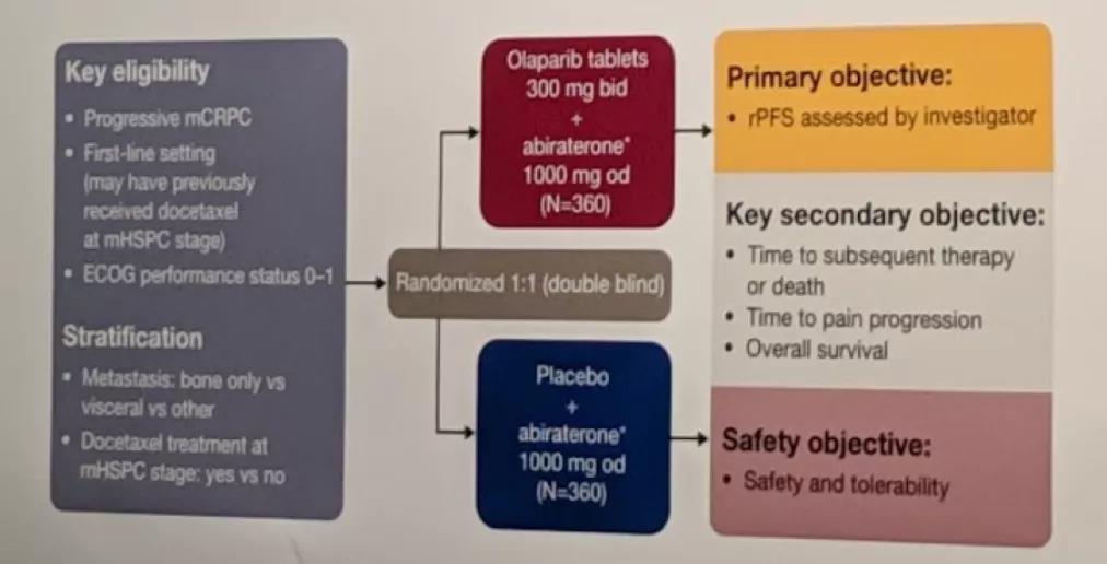 ● PROpel:奥拉帕利(ola)+阿比特龙(abi)对比安慰剂(pbo)+阿比特龙(abi)作为转移性去势抵抗性前列腺癌(mCRPC)患者(pts)一线(1L)治疗的III期试验
