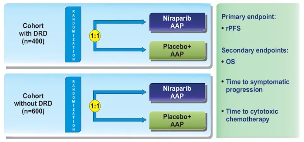 无独有偶,MAGNITUDE研究和PROpel研究几乎是一对“孪生兄弟”,同样是将尼拉帕利+阿比特龙用于mCRPC患者一线治疗。MAGNITUDE在研究设计上分为有DRD(n=400)或无DRD(n=600)两个队列,主要终点是每个队列的rPFS,其中队列1的显著性界值为92%效能下HR≤0.65,队列2为94%效能下HR≤0.67,P<0.05。