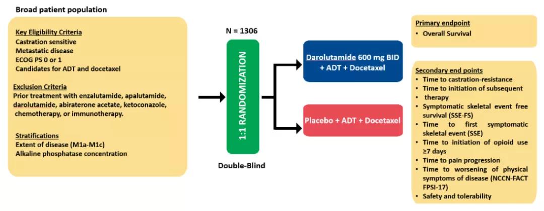 ARASENS试验是一项前瞻性比较达罗他胺+多西他赛+ADT与安慰剂+多西他赛+ADT治疗mHSPC患者的3期试验。该研究的主要终点是OS,次要终点包括至CRPC时间、后续抗癌治疗时间、首次出现症状性骨骼事件时间、疼痛进展时间和安全性、耐受性等。