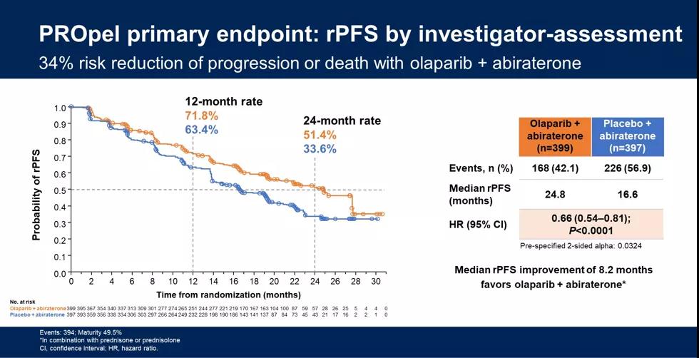 [1]PROpel: Phase III trial of olaparib (ola) and abiraterone (abi) versus placebo (pbo) and abi as first-line (1L) therapy for patients (pts) with metastatic castration-resistant prostate cancer (mCRPC).ASCO-GU2022,Abstract #11