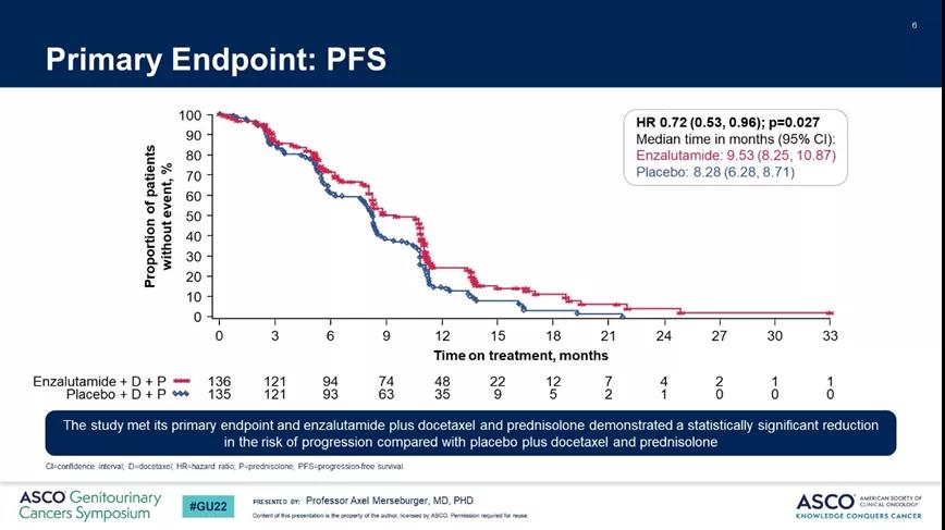 [4]A randomized, double-blind, placebo (PBO)-controlled, phase 3b study of the efficacy and safety of continuing enzalutamide (ENZA) in chemotherapy-na?ve, metastatic castration-resistant prostate cancer (mCRPC) patients (pts) treated with docetaxel (DOC) plus prednisolone (PDN) who have progressed on ENZA: PRESIDE.ASCO-GU2022,Abstract #15