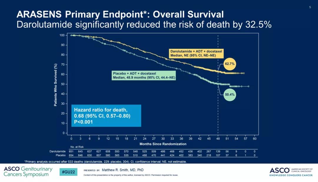 [3]Overall survival with darolutamide versus placebo in combination with androgen-deprivation therapy and docetaxel for metastatic hormone-sensitive prostate cancer in the phase 3 ARASENS trial.ASCO-GU2022,Abstract #13
