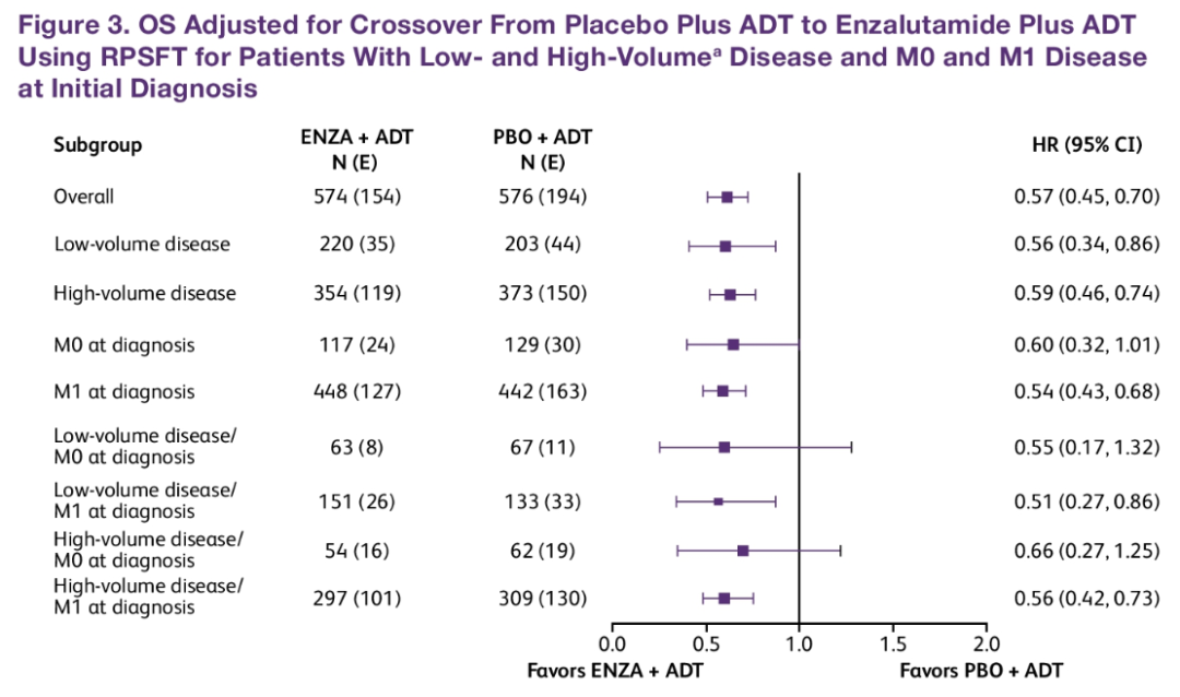 本次ASCO-GU报道了ARCHES研究的事后分析。我们可以看到,该研究揭盲后,安慰剂组有180例(31.3%)患者交叉至恩扎卢胺;包括交叉治疗在内,安慰剂组中有多大401例(69.6%)患者接受了后续治疗。在这样的情况下恩扎卢胺组仍能获得一致的长期获益。按照疾病负荷、初诊M1或M0进行分层,总体上恩扎卢胺组的获益保持一致,无论低负荷(HR 0.66)或高负荷(HR 0.66),以及M1(HR 0.63)或M0(HR 0.71),恩扎卢胺组的死亡风险均有降低;在调整交叉治疗因素后,恩扎卢胺治疗的获益更明显,总体人群的OS HR降低至0.57,各亚组的OS HR也有进一步降低。