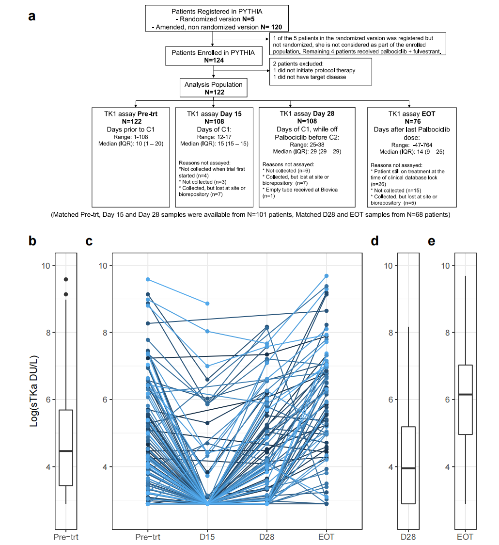 图1.a:TK1检测中PYTHIA患者参与和血清样本可用性流程图。b.c.d.e:sTKA分布。