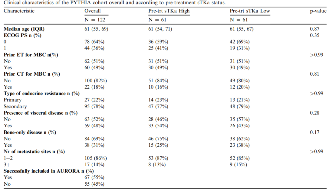 表1.根据治疗前的sTKa状态,对整个PYTHIA队列的临床特征进行分析
