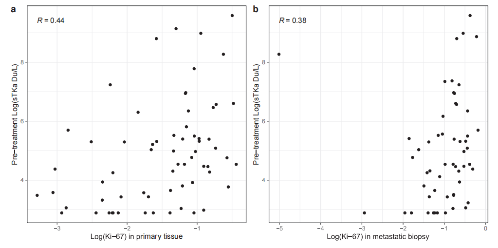 在原发组织或转移性活检中观察到sTKa与对数转化的Ki-67之间存在中度关联(SpearmanΡ分别为0.44和0.38)(图2)。