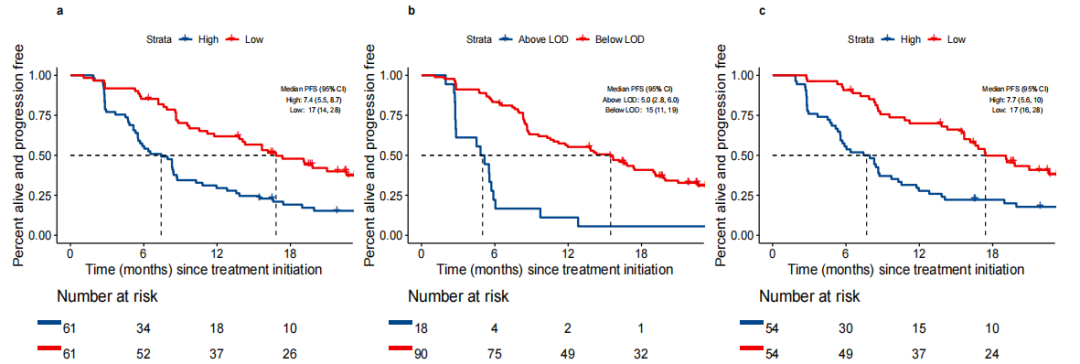 图3.根据sTKa值分布的PFS。(a)治疗前的sTKa(n=122);(b)D15低于或高于LOD分布的sTKa(n=108);(c)D28中位sTKa分布(n=108)。